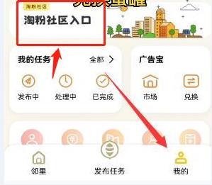 3、登录成功后,在“我的”界面点击淘粉社区入口,