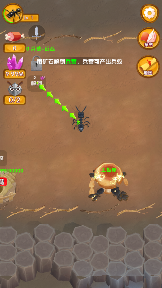 1、在本站下载安装好后,打开游戏,首先我们把蚂蚁拖动到【解锁】这两个字上,用矿石解锁兵营,兵营可以产出兵蚁;