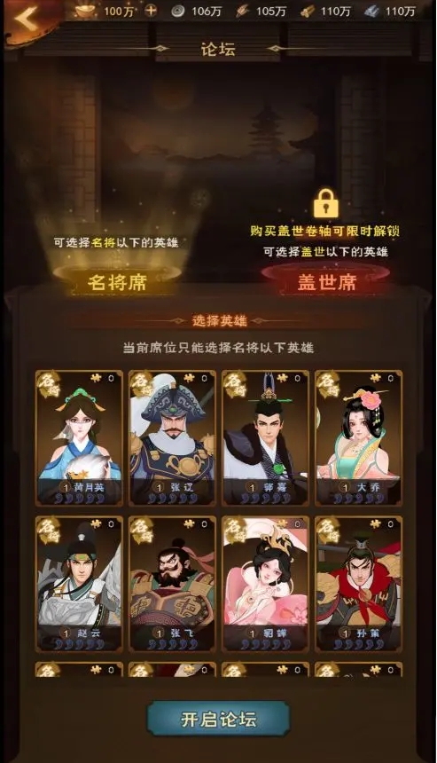 论坛有两个席位,分别可以派遣名将和盖世英雄;