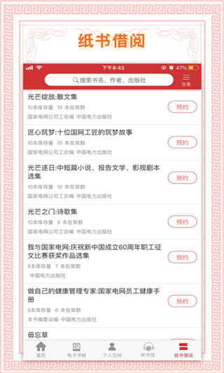 书香国网app最新版是由英大传媒集团专门为国家电网公司工会打造的一款图书移动阅读应用,用户通过软件内的书籍同步功能可免费阅读优质畅销图书,满足我们每日的阅读欲望。软件内所拥有的图书资源非常的多,种类也是特别的繁多,包括军事、医学、哲学、国学等80余种类别,大家可以根据自己的喜好需求进行在线阅读或者收藏阅读,并且这些内容都会实时进行更新,大家可以第一时间阅读到最新的书籍内容,做真正的第一人。此外呢除了上述所说的资源之外,书香国网其他的功能也是让人感到非常舒适的,它里面有听书馆,微报刊、纸书借阅等诸多贴心功能,让贴心化的阅读方式,让用户随时随地都能点击阅读,致力于带给你最为极致的使用体验,对这款软件有需要的用户,现在赶快来下载体验吧。 软件功能 1、海量正版电子图书 书香国网提供上万种优质图书 2、个性化设置 字体大小调节,护眼夜间模式 3、书签标记 多书签标记功能 4、多种手势 多种手势设计,便捷的操作体验 书香国网app使用方法 1、打开书香国网app,进入个人空间获取移动借阅卡 2、然后进入电子书城中即可挑选喜欢的电子书 3、进入书籍详情页面中即可将书籍添加进书架 4、在书架中就可以对书籍进行管理,自由阅读 5、在纸书借阅页面中,可以预约借阅纸质书籍 更新日志 v1.71版本 提升了稳定性。