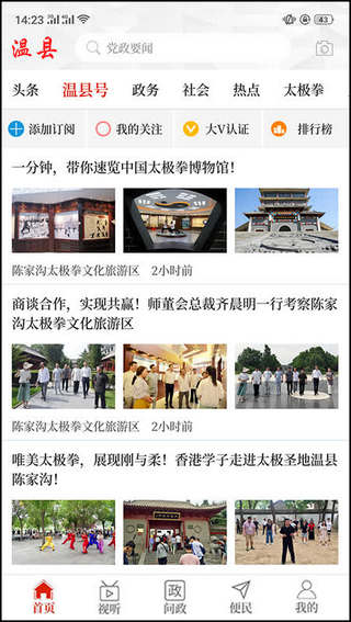 温县乡亲们在哪里~快来下载这款云上温县app啦!这是一款内容非常全面同时又独具咱们温县特色的手机新闻客户端,操作简单且设计精巧,让大家足不出户轻松获取各类最新动态,包含音频、视频、图文、直播等多种形式的新闻资讯,多元化的新闻时事,整合了优势媒体资源,内容丰富、信息量大,大家能够用这一资源,推广学习、不断提升自己,通过学习加快知识更新、优化知识结构、拓宽眼界视野。同时应用专注于温县本地的新闻资讯服务,能帮助本地老百姓了解最新的新闻资讯、周边大小事,最厉害的是咱们还可以使用它学习太极拳~~点开首页即可看到太极拳栏目啦~每天跟着练上一拳,强身健体还能防身!不过大家看的最多的还是社会热点这些页面,还有直播、转播视频,央视转播等等,没关系,反正使用它你能够获得许多新鲜资讯就可以啦!各位乡亲们赶快下载起来~~