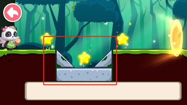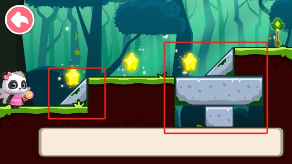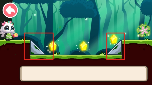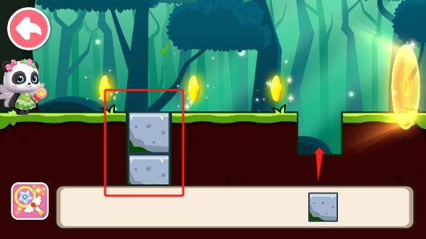 前方道路太高,几何块不够用怎么办?别忘了有特殊装置:放上弹簧,一跃而上。咻,安全到达高处。如何运用道具,考验着宝宝的全局规划哦。