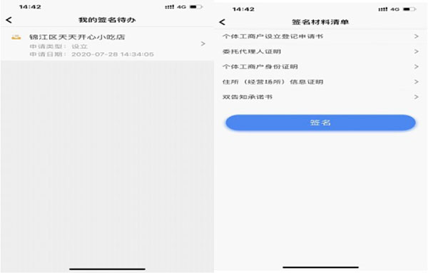 7、签名环节。通过个体开办的“签名待办”环节,进入签名界面,在我的签名待办中找到对应申请件点击进入,浏览签名材料清单后进行签名,在业务签名界面点击左侧“点击签名”,打开签名板,在签名框内进行签名,签完后提交,点击页面左侧“提交签名”完成签名步骤。