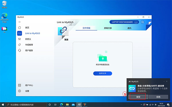 3、在电脑端右下角会跳出弹窗,点击 ⑤[接受],即可完成传输