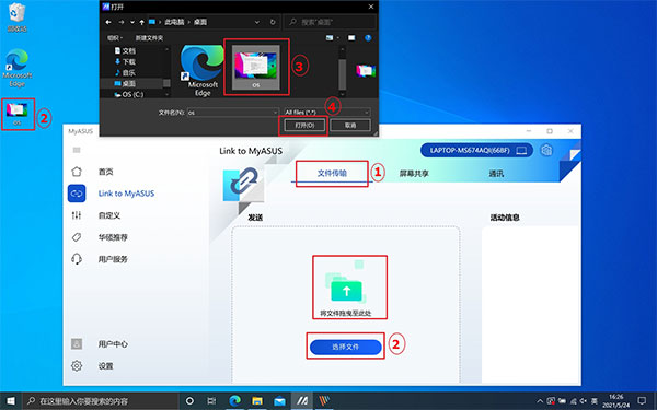 1、在 ①[文件传输] 下,点击 ②[选择文件],或者您也可以直接拖动 ②[文件] 至 [将文件拖曳至此处],然后再弹窗内点选 ③[文件],然后点击 ④[打开]