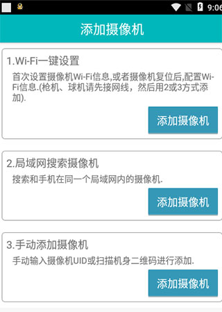 1、添加摄像机,运行APP,点击右上角(添加)按钮,进入设备列表界面,然后选择“手动新增”进入新增摄像 机界面,如下图所示。