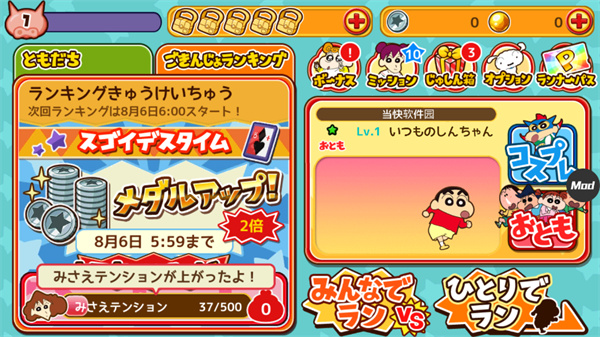 蜡笔小新跑酷是一款根据同名动画改编而来的酷跑类游戏,在这款游戏当中我们除了能够与小新一起跑酷之外,还能够邂逅小新的基友风间,以及与小葵一起闯关哦。因为是根据动画改编而来嘛,所以呢画风方面游戏也是采用了日系卡通风格打造,完美的还原了动漫中的蜡笔小新、美伢、小葵、动感超人、小白,等经典人物,而且还有原版角色声优倾情配音,致力于给玩家用户带来最真实的童年回忆。玩法方面呢也是非常简单的,就跟其他的同类游戏差不多,手指上下滑动屏幕就行,不过呢随着时间的增长,后面难度肯定是越来越大的,极其考验玩家用户的眼力以及反应能力。还有就是每位角色都拥有属于他们的特色能力,我们在避开各种障碍物的同时,还要收集沿途中的金币、道具,以及躲开最讨厌的青椒和胡萝卜,这样游戏结束的时候我们的得分才会更高哦!本次为大家带来的是蜡笔小新跑酷破解版下载,游戏已为大家内置一个修改器功能,开启后可修改人物不会受伤、弹跳力加强、没有广告以及可以使用各种技能供十二项属性,提高大家的游戏体验!