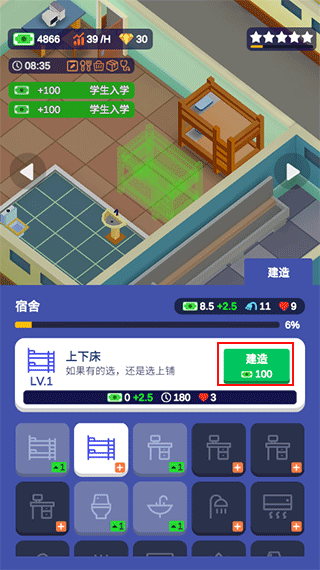 1、新生开学有多少学生入学,取决于宿舍有多少空闲床位可用,点击建造即可开始建造床。