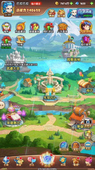 上面一排是福利活动,中间的各个小屋是特定功能玩法,下面是个人养成和副本,简单明了。