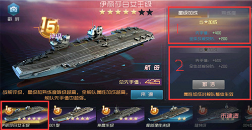 首先我们看到左上角为整体总侦查能力值,右上角为战舰整体展厅里面有各种精美的战舰大图,加成总计。练营里面整体有5项分别为航母、驱逐舰、护卫舰、巡洋舰、潜艇,我们先来看看航母。下图是伊丽莎白女王加成图,其中框1表示星级加成,图中现在的女王是5星加成的属性,框2是表示6星后女王即将加成的属性,由图看见我们是可以根据自己的舰队来堆自己需要的属性的,女王是加成全体战舰突防的。