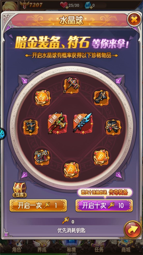 3、钻石建议玩家先进行一次水晶球的十连,可以获得一些不错的装备,前期打怪的效率会猛涨。另外就是技能这一块了,技能树左右各九个,前期建议把生命祝福和魔力灌注点出来,一个回复生命一个回复魔力,简称永动机组合,然后左边偏攻击,右边技能偏防御,建议玩家根据技能属性合理搭配。属性点的话,建议攻击和魔力对点,然后把防御和生命各点出2-3点,堆一下防御,防止被BOSS秒杀。