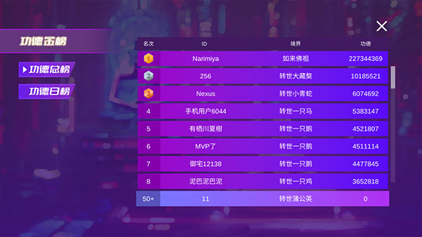 3、得分就是功德数,点击右上角的功德金榜还可以查看游戏内其他玩家功德排行榜。