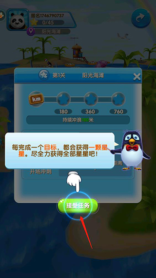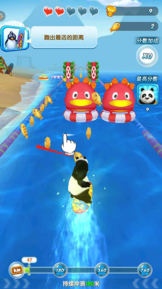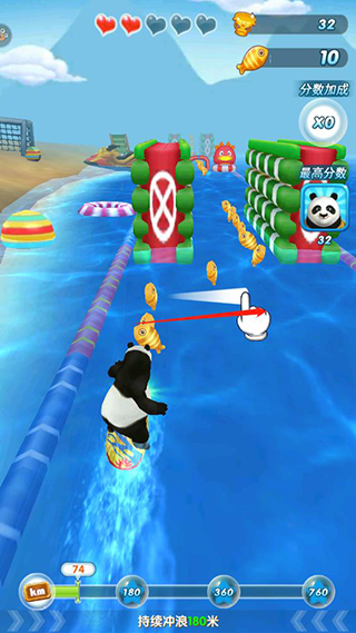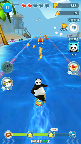 每个关卡的任务要求都不同,除了收集小鱼和冲浪距离之外,还有可能是要求搜集苹果、穿过障碍物、调休猴子、暴击外星人等。单关卡的奖励星星最高是3星,但是自己的最高记录是可以无限被刷新的哦。只要你技术高超,可以把超越你身边的小伙伴一大截,成为小伙伴的膜拜对象。