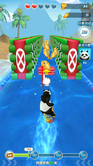 在游戏中,玩家的目标是展示KUNG FU的魅力,用永不言败的精神走遍世界各个角落,激情闯关,迎接着一个又一个全新挑战。玩家每闯过一个关卡,都可以获得一次翻牌抽奖的机会,在竞技模式中排名前三的更是可以获得丰厚的奖励!所以请尽我所能获得高分,成为世界最顶尖的功夫冲浪高手,完成成就任务以及打破记录来获取更多多的小鱼和钻石吧!