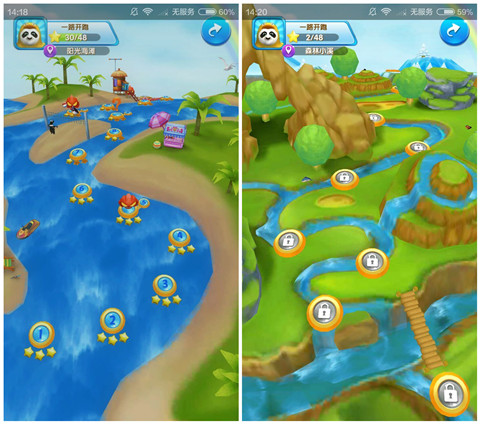 生活本身就像是一个玩游戏闯关的旅程,闯过这一关还有下一关。这个夏天,熊猫大侠带你开启炫酷闯关,体验清凉夏日冲浪、探索未知的精彩,《功夫冲浪》关卡关卡模式冰川河道等你来激战!《功夫冲浪》关卡模式目前开启的有阳光沙滩、森林小溪、冰川河道三个主题地图,每个主题需要的星星数量都不一样,玩家必须在当前主题关卡中收集足够数量的星星才能开下一主题!除了阳光沙滩第一个关卡是可以直接玩的,其他地图关卡都需要解锁才能玩哦。