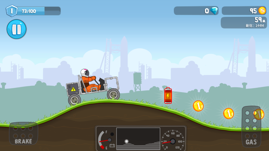 6、左边就是刹车,右边就是前进了,途中可以拾取金币以及油箱,获得的越多游戏奖励越丰富;注意不要让赛车翻跟头哦!如果途中赛车翻跟头了那么游戏也就失败了。