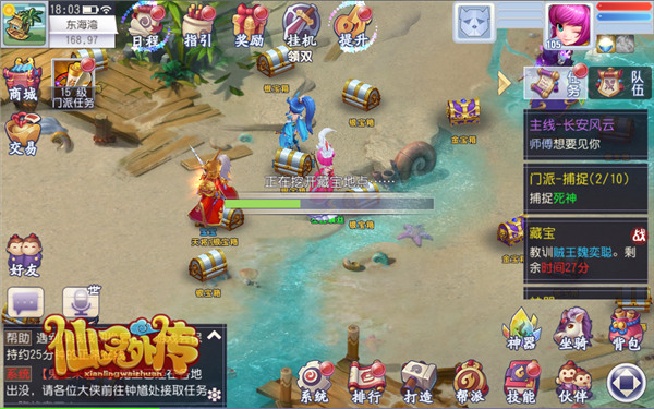 其次《仙灵外传》的藏宝图任务是单人任务,等级达到25级后,点击任务指引,就能看到藏宝图任务啦!