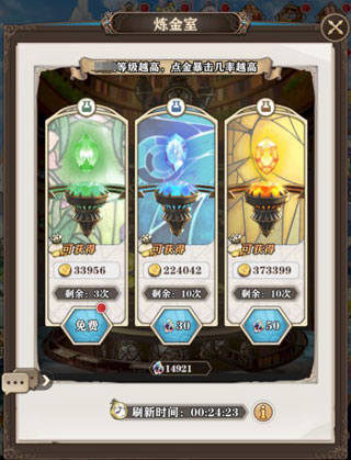 三、炼金入口这大概是游戏里最方便的来钱途径了,进入的位置在屏幕最上方显示金币数的位置,点击加号即可进入到炼金室页面,在这里我们可以每日进行3次的免费炼金,也可以花费星石进行额外的炼金。这边实际上通过日常任务就可获得数量不少的星石,所以尤娜认为完全有条件可以直接连同隔壁的收费炼金一起吃掉(如果有必要的话)。