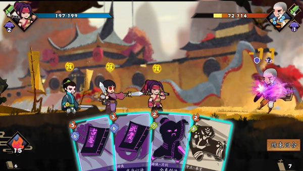 2、战斗过程中点击卡牌会显示其详细的属性和功能,拉拽至角色上能进行使用,使用卡牌会消耗怒气,怒气用完或者卡牌用完点击回合结束即可。
