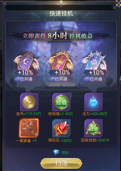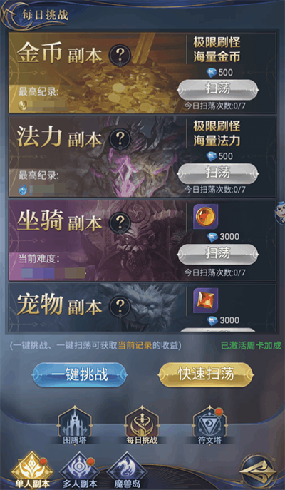 此外,每日挑战、单人BOSS的扫荡功能可以一次性清除多个挑战,从而迅速获得大量的奖励;