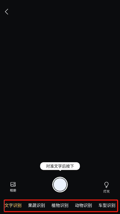 我们可以点击首页上的文字识别功能,对准文字后直接按下中间那个按钮,就可以直接识别;在下方还有果蔬、植物、动物、车型等功能的识别,我们可以直接点击就可以进行切换,操作方法与文字识别功能一样;