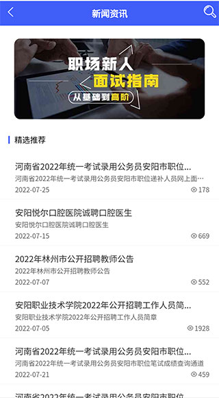 1、招聘会:招聘会信息快速掌握,每周二,四,六,安阳人才市场见。2、简历个性化:简洁版,完整版,视频版,无缝满足不同的岗位要求。