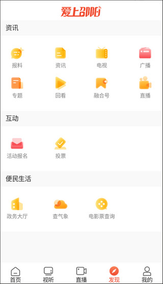 1、下载安装点击进入爱上邵阳app,可以看到总共有首页、视听、直播、发现以及我的五大功能页面