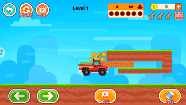 1、这是一个考验你思维和脑力的趣味画线游戏!2、你需要在屏幕上画线,帮助小货车跨越各种地形,想办法让可口的水果和蔬菜一个不落地装进车里。