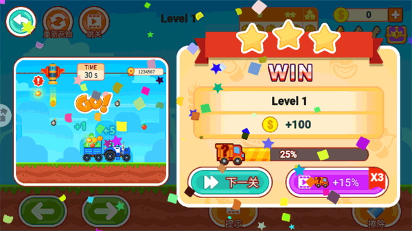 3、等所有水果都进入货香就是通过本关卡了。
