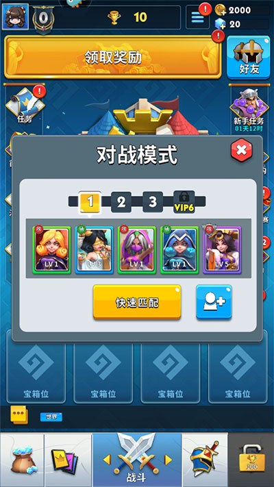 9、之后,进行同样的步骤,获得四个英雄,完成任务进度后,进入游戏首页,领取奖励;