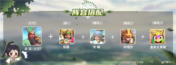 阵容一:关羽、亚瑟、女娲、孙悟空、皇家史莱姆
