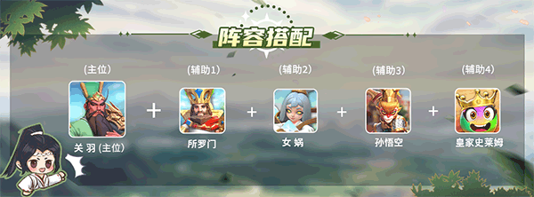 主要思路是开局利用所罗门快速铺场,利用史莱姆角色升星,由孙悟空复制角色,将关羽铺满全场,再使用女娲对关羽进行升星,当场上铺满关羽后,由队友利用服部半藏对关羽升星,由于关羽释放的【斩杀】是单体技(激活神器后是范围攻击),所以需要队友带控制型角色(如卑弥呼、妲己等)辅助关羽进行输出。
