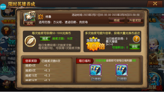玩家每日登录可以在每日福利处领取登录奖励,每日玩家相应的任务也能领取各种丰厚的道具,登录七天能领取一个SS级极品英雄