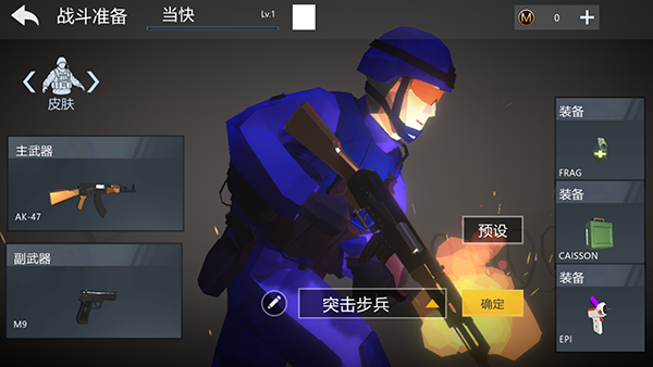 3、进入战斗准备阶段,可以选择自己要玩的兵种,不同的兵种武器和装备也不一样,还可以自定义装备。