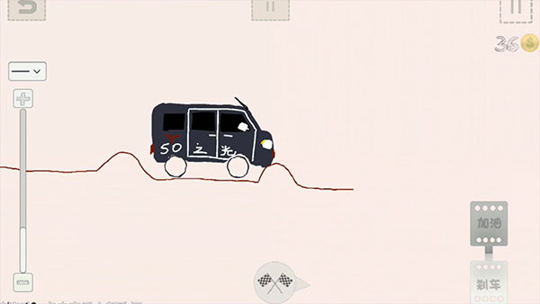 4、小车制作完成后点击上方的三角形按钮,进入驾驶阶段中,通过左侧的【加油】、【刹车】来控制车辆的前进和后退;