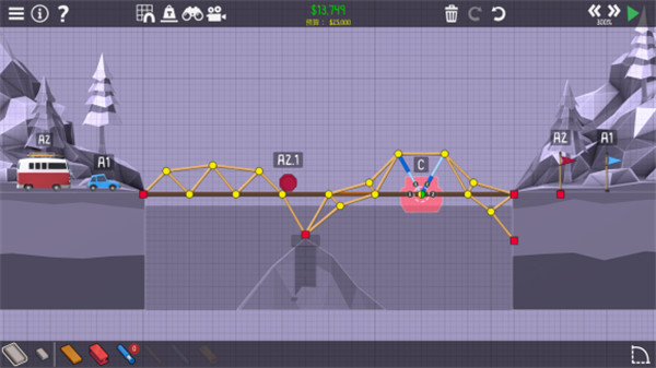 这是本些列中第一个需要用到液压杆的关卡。两个液压杆都是收缩50%。现在液压杆的收缩与拉伸在设计图和模拟时都能有很直观的体现,当然这关也可以做成把路面往上拉的