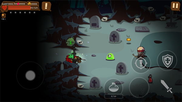 1、熟练掌握每一种武器的特征,每一把武器还有自己独特的技能,拖动方向键来控制人物移动,左上方血量为0时则挑战失败。