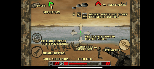 ‘抢滩登陆战2002游戏’英文名可以叫做‘Final Defence’,这是一款非常好玩的军事射击游戏,采用了多年未变的战斗场面,一进入游戏就知道这款游戏是一款军事题材的射击游戏,顾名思义,这是一场你与敌军为了争夺这片海滩所展开的战斗,如果你不能及时击败敌军,而且还让敌军乘机霸占了这片海滩,此次任务则是以失败告终。为了有效提升游戏趣味性,抢滩登陆战2002游戏为玩家们准备了海量武器供你使用,其中包含了:格林机关炮、机关枪、火箭弹以及空袭指令等武器,每种武器的伤害都是不一样的,在游戏中玩家所需要攻击的敌军种类也是非常丰富,多达十余种,包括飞机、坦克、战舰等,伴随着关卡的提升,游戏的难度也是会有所提升,非常具有挑战性。对于游戏玩法而言,玩家控制的是画面近端的一个自由炮台,目的是防止敌方军队登陆到海岸上,移动轮盘可以控制画面上的准星,按下触屏开光即为开火,玩家需要面对的是地方的联合作战单位,包括:空中的战斗机,地面的战车以及蜂拥而至的步兵,在他们到达奔放炮台之前,将其统统消灭即可。还在等什么呢?喜欢的朋友们快快前来下载体验一番吧!
