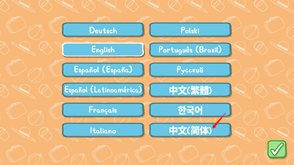 1、在本站下载安装小猪佩奇假日冒险游戏后打开,进入游戏可以进行更改语言,默认为英文,选择中文(简体),点击确认更换语言;
