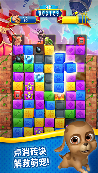 1、匹配两个或更多同色砖块来移除障碍。2、可到宠物乐园去与救出的宠物一起玩耍。