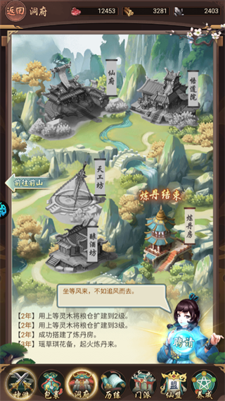 洞府分为前山和后山,在前山有灵池,鸿蒙秘藏、仓库、机关兽四种设施,在后山设有仙府、天工坊、炼丹房、悟道院、酿酒坊五种设施。