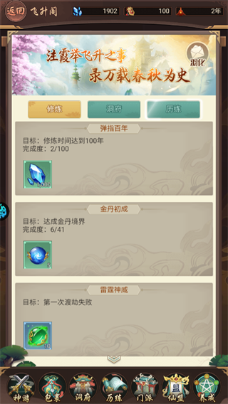 玩家可在悟道院里进行悟道修行,领悟道书可增加修为和悟道经验,道书可通过购买和兑换获得(购买神魂悟道可自动参悟道书)。