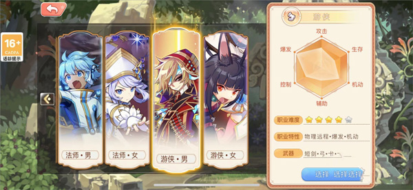 首先是职业推荐,目前游戏战士,盾卫,法师和游侠四种职业,每种职业又分为男女,性别的区别主要是外观,属性上并无二致。战士和盾卫属于新人友好职业,各方面能力都比较均衡,战士输出略高,而盾卫则是生存能力更强,二者都是近战职业。