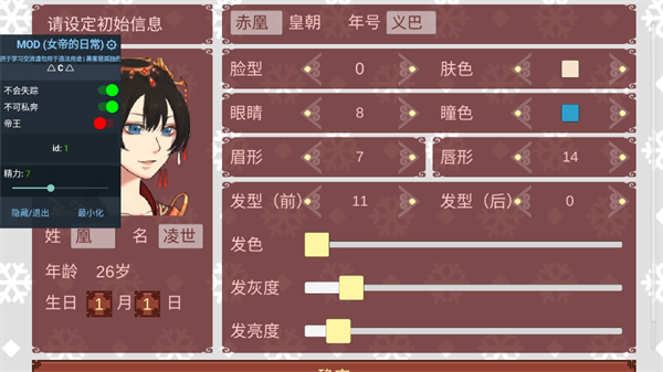 在女帝的日常破解版这款游戏里大家可以实现成为女帝的梦想。玩家将在游戏中扮演一名开国女帝,初次进入游戏可以设定初始信息,比如姓名、生日,还可以设定你所在的皇朝和年号,也可以根据自己的喜好调节脸型、肤色、眼睛、瞳色、眉形、唇形、发型前后、发色、发灰度、发亮度等等,让玩家有更强的代入感。玩家需要想办法平衡朝堂、制约后宫,将自己的皇朝传至万代,游戏玩法丰富,有丰富的政务系统,其中包含了任命、提案、批奏,还有移动、人物等系统,此外拥有后宫佳丽三千的梦想在这里也可以实现,对有好感的角色就可以将它纳入后宫中。游戏可以说是比较贴近古代皇帝生活了,感兴趣的玩家可以来下载试试!