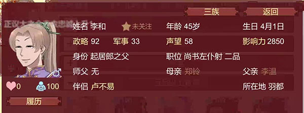 然而并不是100忠诚就代表着能重用,得对臣子的三族、支持者、以及政略做一个大致的评定。