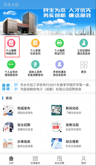 天水人社app是天水市人力资源和社会保障局为广大市民打造的“互联网+人社”惠民服务平台,主要提供个人权益查询、个人申报业务查询、公共信息查询等多项功能,是“电子社保卡”在人社系统的全应用示范项目。天水人社平台平台围绕市民关注的人社领域热点问题,及时发布政策法规、办事指南等权威资讯,让广大天水市民随时随地享受“智慧人社”贴心服务!另外天水人社还为用户提供了社保缴费查询,个人信息查询,工伤待遇信息查询,以及退休人员养老待遇信息查询等功能,即时发布人社新闻资讯,政策法规等相关人社动态信息,让用户做到足不出户了解人社最新政策。