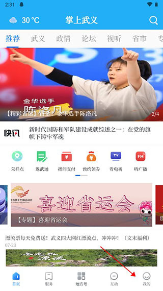 1、在手机上打开掌上武义客户端,点击首页底部的菜单栏【我的】。