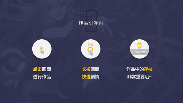 1、进入游戏可以看到先有一个作品引导页,这里可以知道游戏怎么操作。