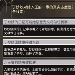 10、对话之后可以得到丁妙妙后腰上的胎记线索,之后点击丁渺渺的房间。在房间当中进行对话,在这里进行三种对话,对话完成之后可以得到丁渺渺猜测马子谦产生臆想。