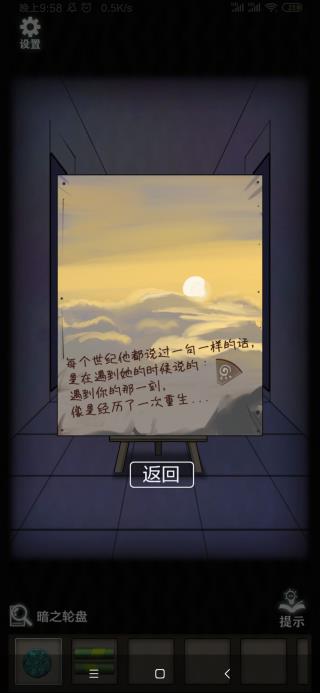 9、木马旁边得到提示“极左之地暗之魔盒”,再来一遍一直往左,得到提示“最黑的路通向光明”和提示图-黑色月亮右下有个图案,尽头有阴之花和暗之魔盒。香炉里点燃四朵花进入梦境,白天捡到火石和树杈,发现树桩下的盒子,盒子上画着金色的鸽子、石头、人和黑色的蝙蝠、墓碑、花;调表,在晚上点燃篝火,点击篝火退出梦境。分别在后广场黄色紫色花的幻境里数出各种元素的数量,得到6位数的密码,回梦境打开盒子得到神之水晶,切到晚上将水晶放入雕像,切回白天发现石化的预言书能翻开了,显示“暗之魔盒开启”。重走一遍打开盒子得到暗之轮盘。回到一开始寄存处旁边的圆形门,装入两个轮盘并调整到提示画上显示的角度。